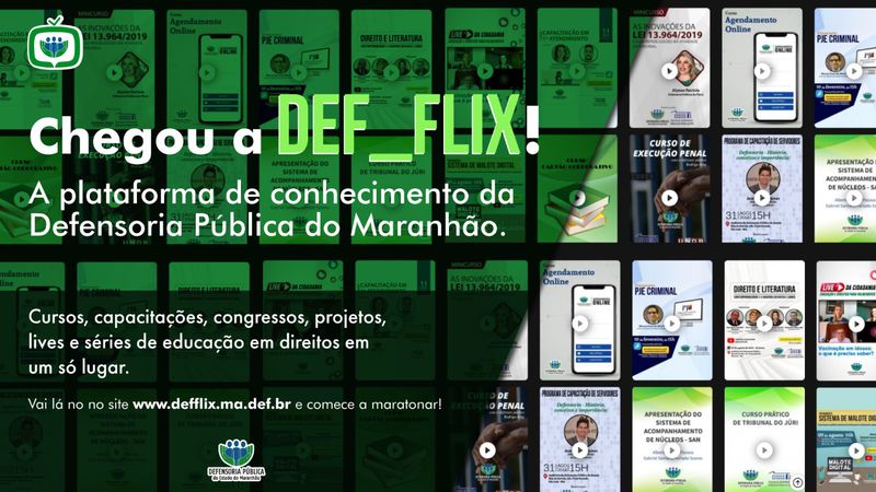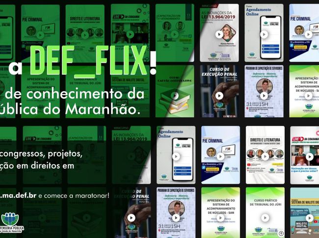 A Defensoria Pública do Estado do Maranhão (DPE/MA) lança nesta sexta-feira a DEF_FLIX, a plataforma de vídeos e treinamentos da instituição que potencializará a educação em direitos no estado. Com a ferramenta, a mais nova iniciativa idealizada por meio da Escola Superior, qualquer pessoa poderá ter acesso ao conteúdo audiovisual produzido pela Defensoria.
