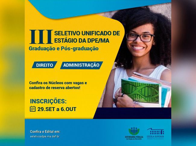 A Defensoria Pública do Estado do Maranhão (DPE/MA) lançou, nesta semana, dois seletivos unificados para estágio de graduação e de pós-graduação. As oportunidades são destinadas ao preenchimento de vagas e formação de cadastro de reserva para atuação nos núcleos da Defensoria Pública, das quais 10% da vagas se destinam a pessoas com deficiência e outros 30% às pessoas negras (pretas ou pardas).