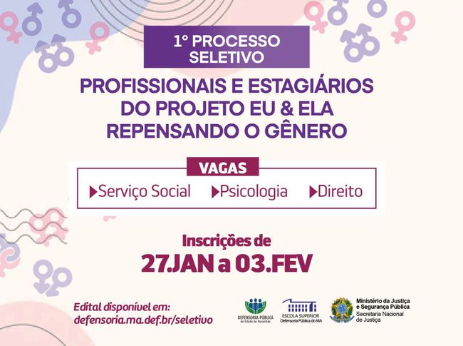 Divulgado pela 1ª Subdefensoria Pública-Geral do Estado do Maranhão, o Edital tem como objeto a instituição da prática social educativa da reeducação de gênero nas unidades prisionais, salas de espera da Defensoria Pública do Estado do Maranhão, escolas públicas e demais ambientes comunitários de Imperatriz e Santa Inês, bem como o fortalecimento dos vínculos familiares dos internos, celebrado por meio do Departamento Penitenciário Nacional e a Defensoria Pública do Estado do Maranhão.