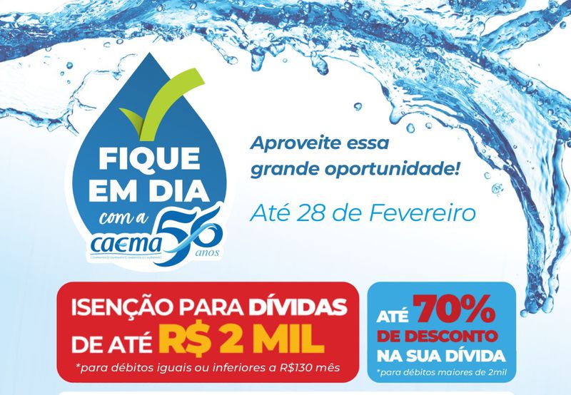 A Campanha “Fique em dia com a Caema” beneficia quem tem débitos até o dia 31 de dezembro de 2022 e é válida para clientes vinculados a imóveis residenciais, comerciais, industriais e também aos poderes públicos.