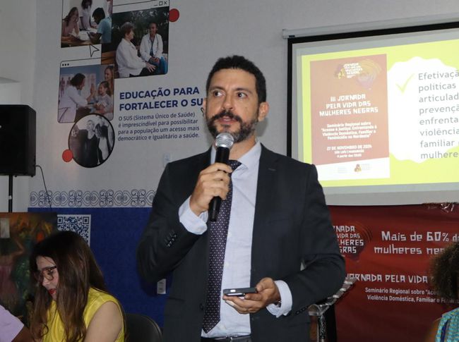 Ainda sobre a temática de enfrentamento às violências de gênero, o defensor público Bruno Antonio, do Núcleo de Defesa da Mulher da DPE, também palestrou no Seminário Regional da 3ª Edição da Jornada da Rede de Mulheres Negras do Nordeste (RMNN), com abordagem do tema "Acesso à Justiça Pela Vida das Mulheres Negras: Enfrentando a Violência Doméstica, Familiar e o Feminicídio no Nordeste".